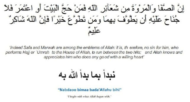 Dua at Mount Safa and Mount Marwah: Before you start Saa’ee at Safa recite the following verse: